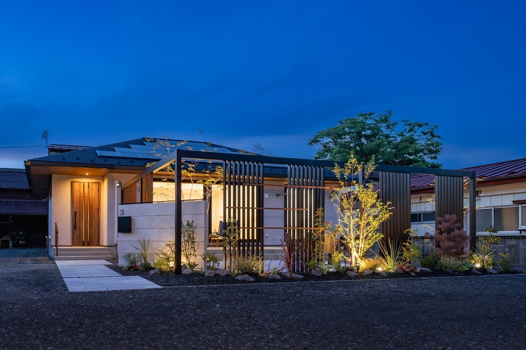 庭と門周りが一体になったデザインです。夜になると、道路からもリビングからも照明が楽しめるようになっております